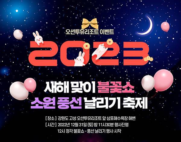 강원도 고성에 위치한 오션투유리조트가 오는 31일 토요일 밤 12시 리조트 앞 삼포해수욕장에서 2023년 새해맞이 불꽃쇼를 개최합니다. 불꽃쇼와 함께 소원 문구가 담긴 풍선을 하늘 높이 날리는 의미 있는 행사도 진행되며 축제 입장료와 관람료는 모두 무료입니다.